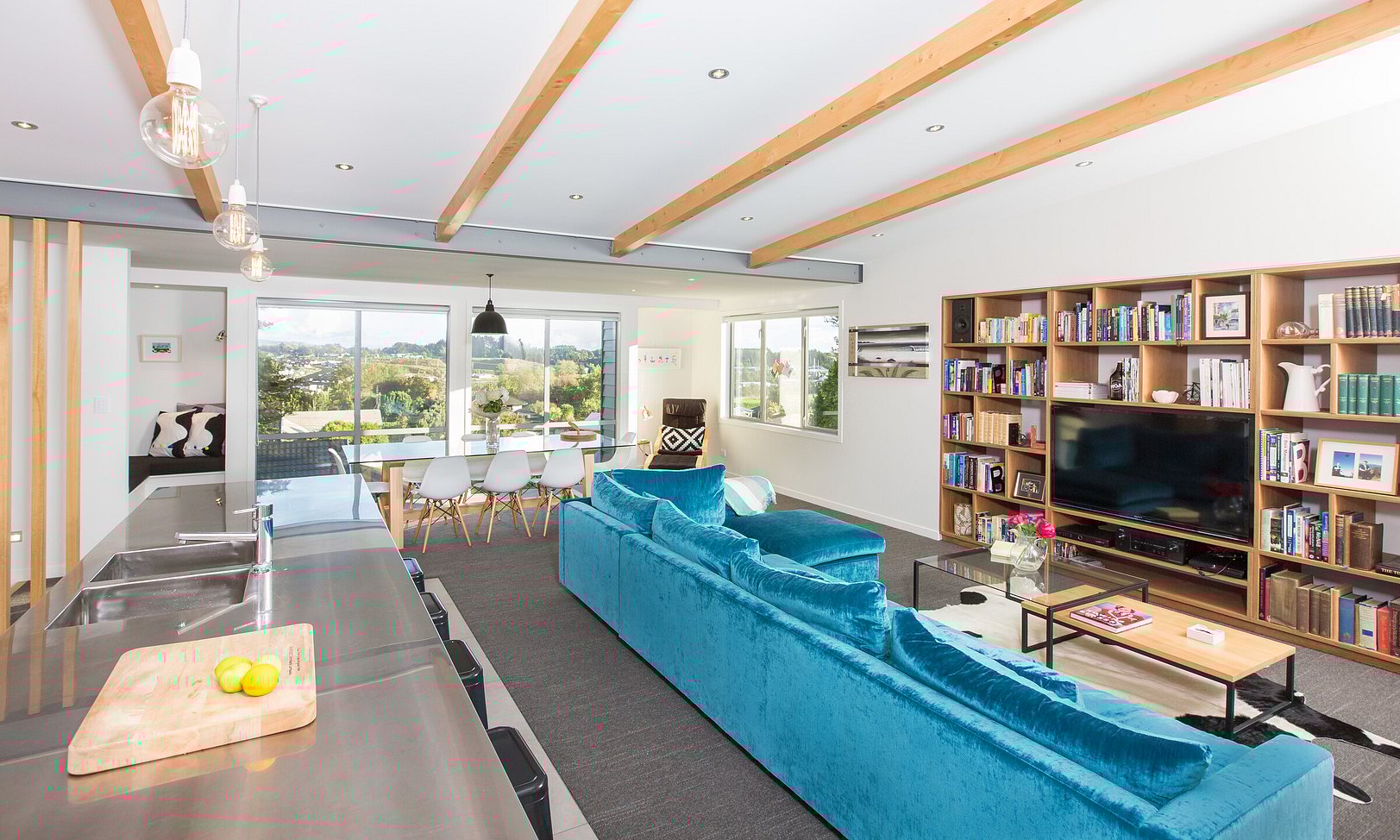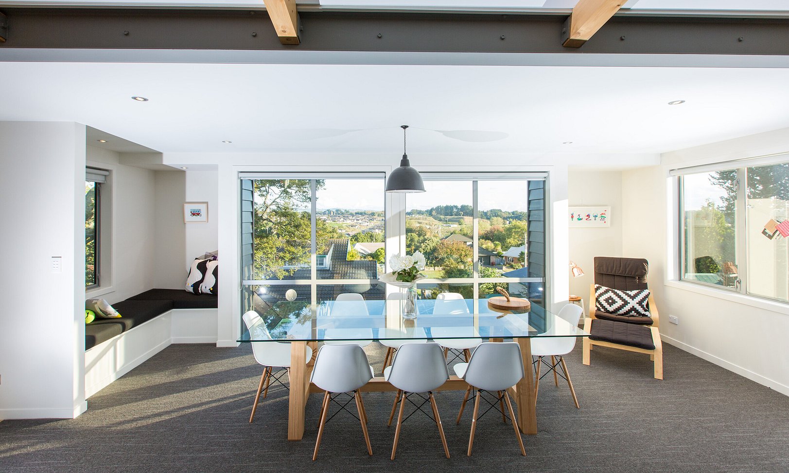 A carefully resolved floor plan and strategic site excavation enabled compliance while unlocking opportunities for elevated living spaces, expressive roof forms, and strong visual connections to the landscape. Light-filled open-plan living, a north-facing deck, and a dramatic glazed stairwell create a sense of volume and flow, while refined detailing and clean mono-pitch forms deliver a modern, highly considered home shaped by collaboration and constraint.