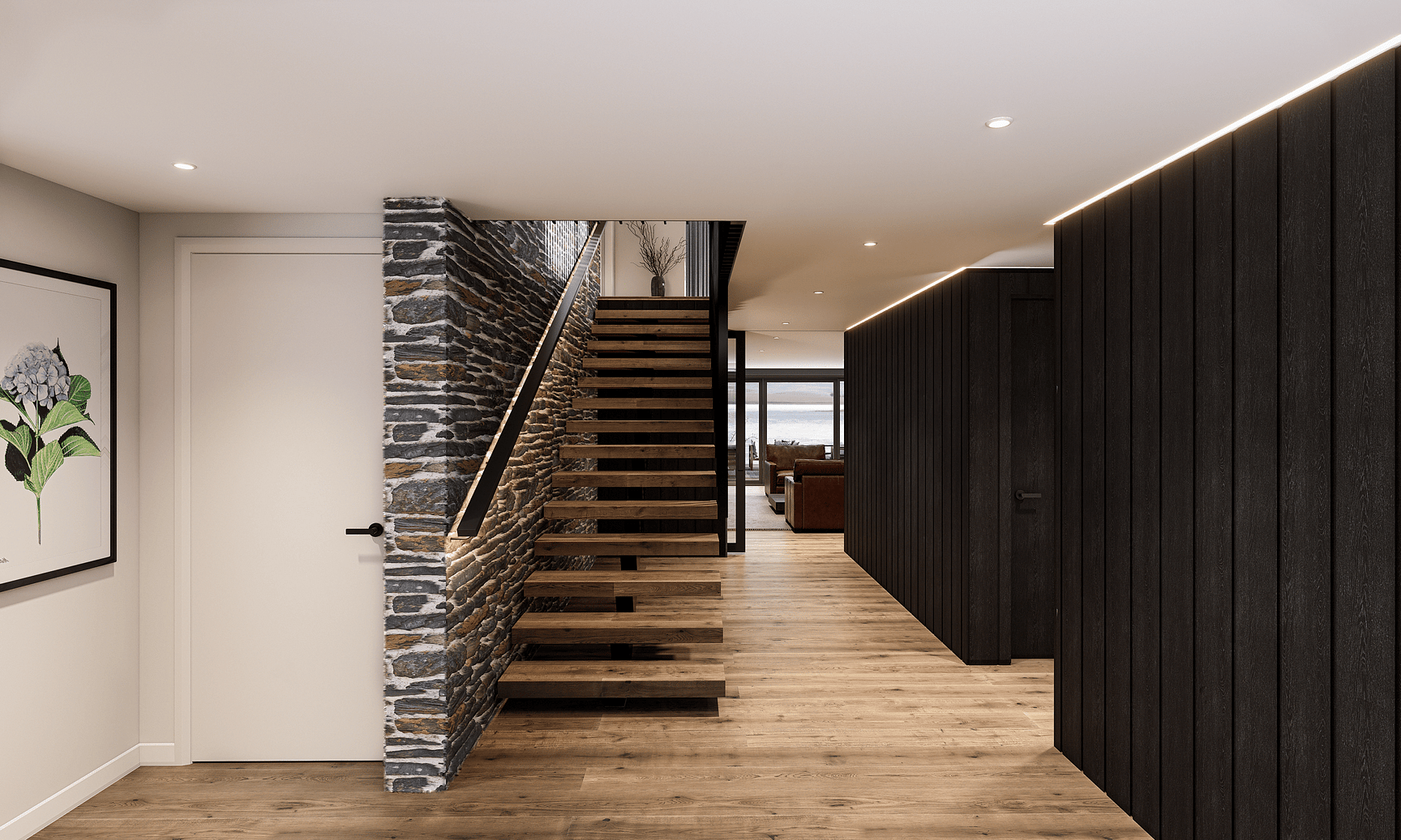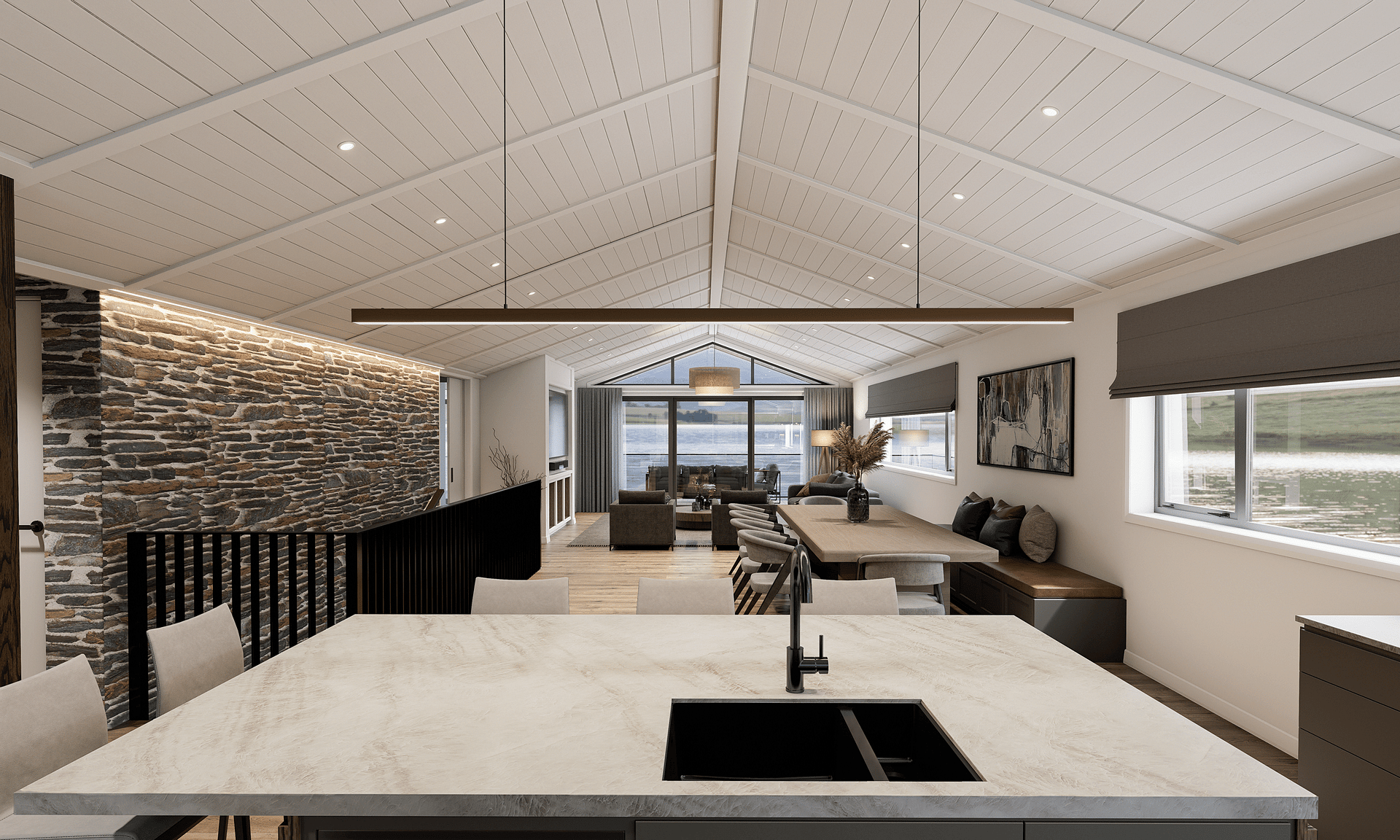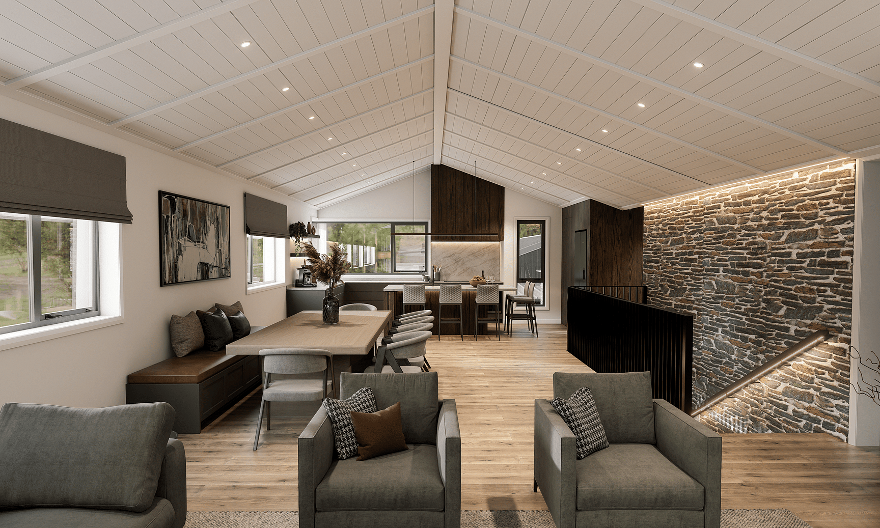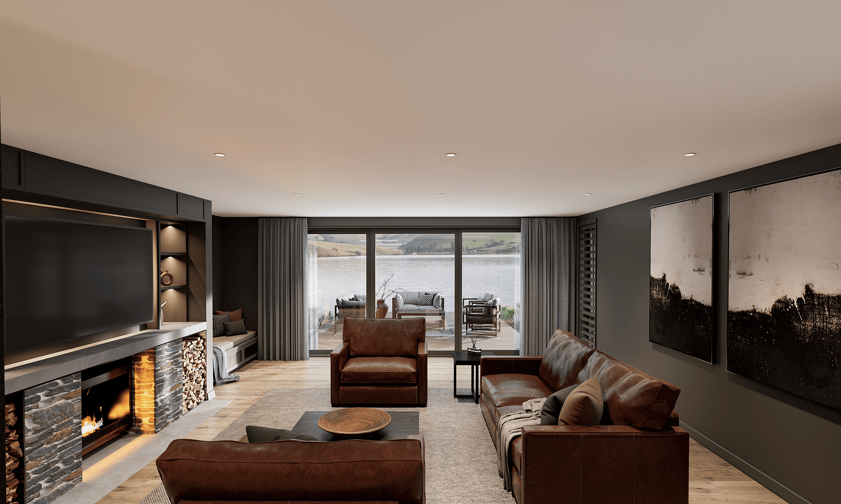 Durable, timeless materiality underpins the design both inside and out. Burnt cedar cladding, natural stone, and layered finishes create depth, richness, and a sense of permanence, reinforcing a classic lake house aesthetic. The result is a robust yet refined home—crafted for longevity, connection, and effortless lakeside living.