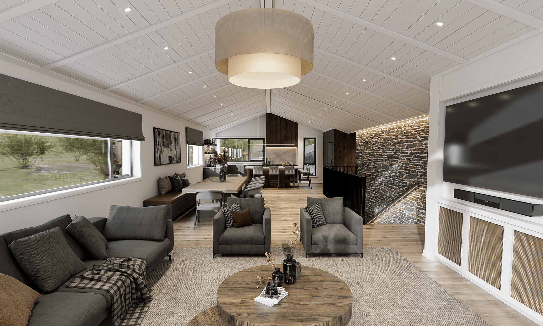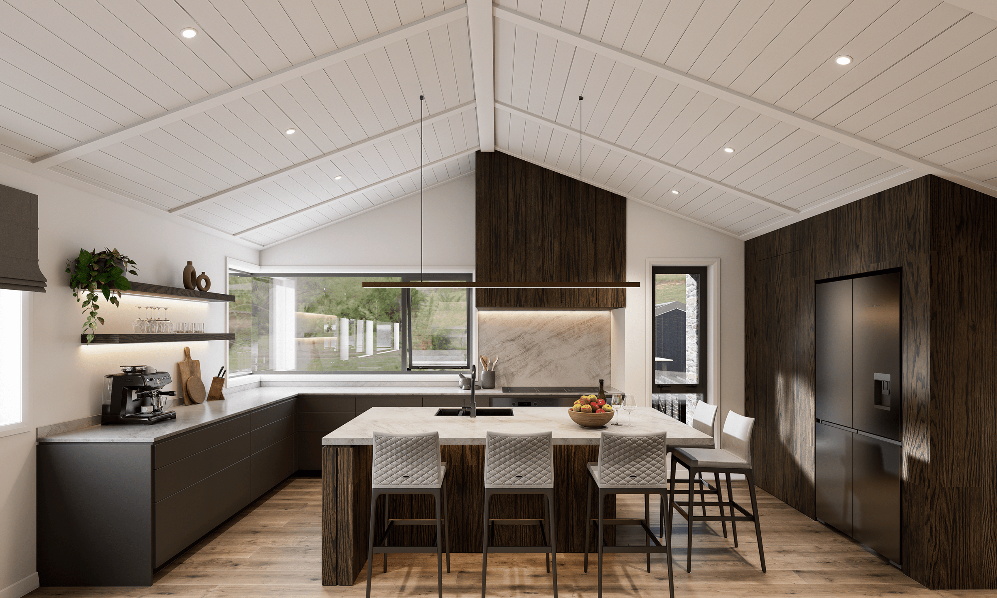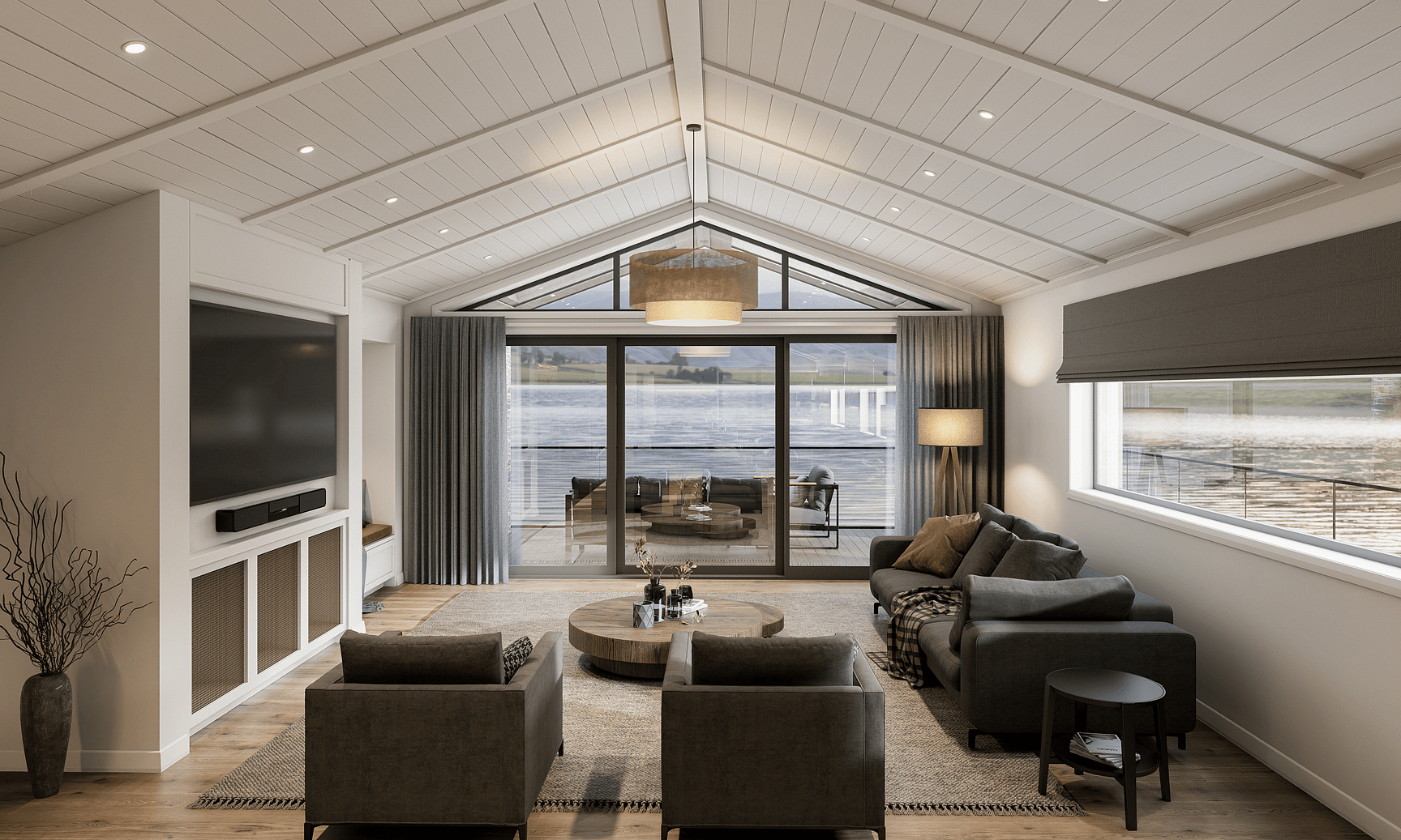 Durable, timeless materiality underpins the design both inside and out. Burnt cedar cladding, natural stone, and layered finishes create depth, richness, and a sense of permanence, reinforcing a classic lake house aesthetic. The result is a robust yet refined home—crafted for longevity, connection, and effortless lakeside living.