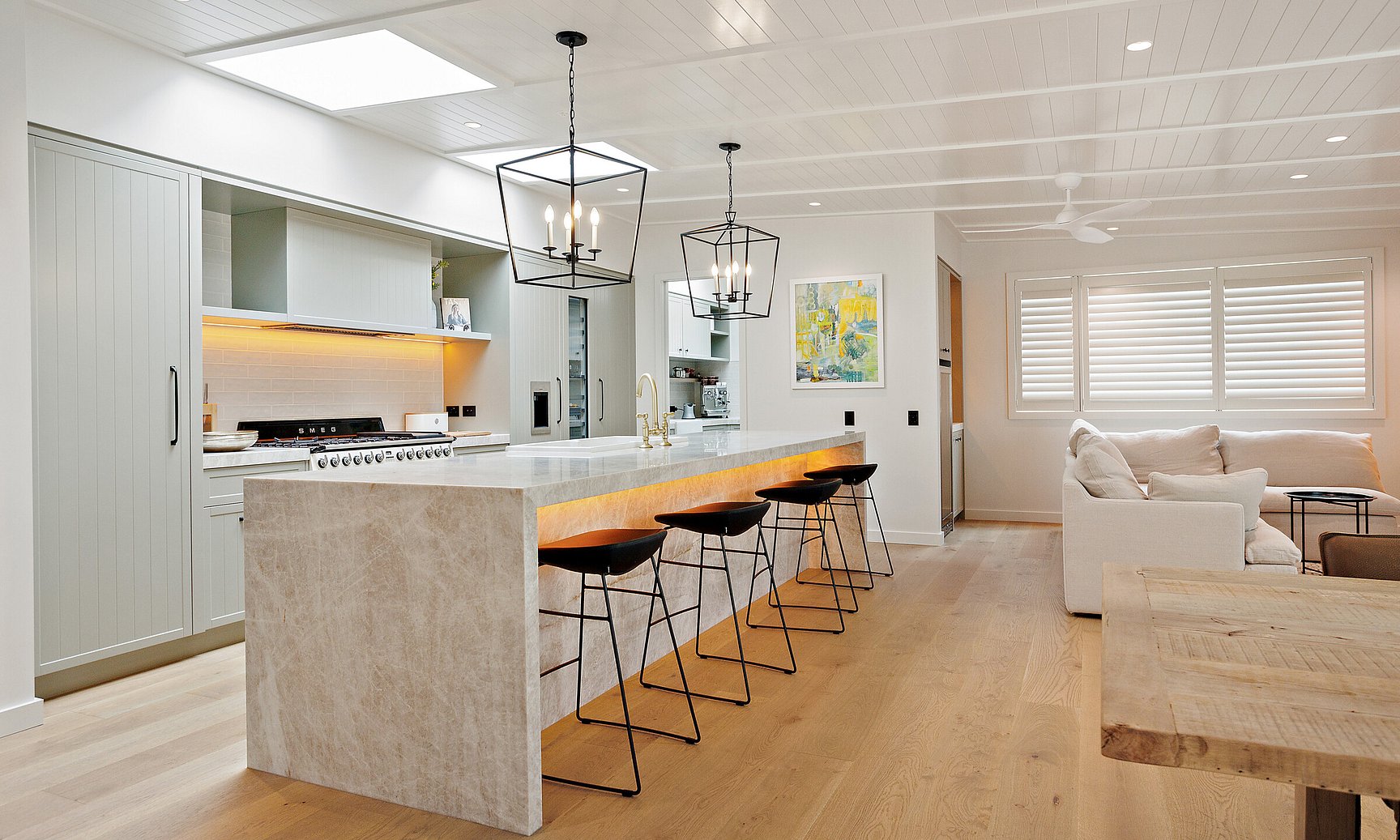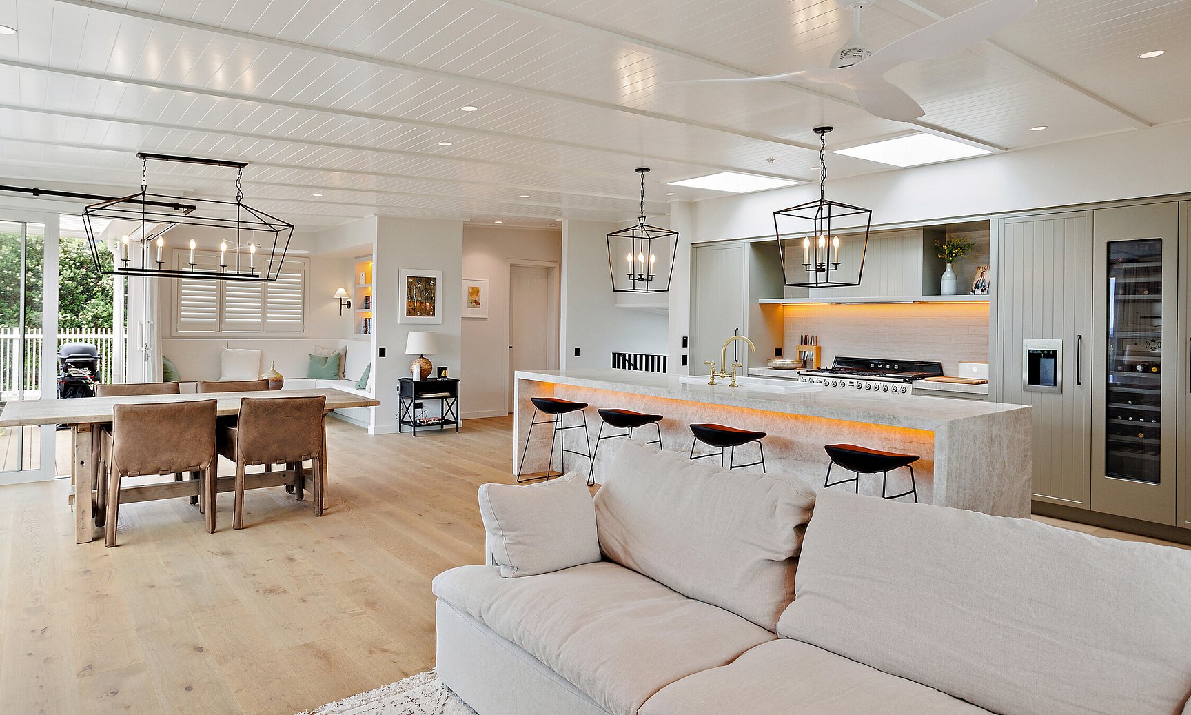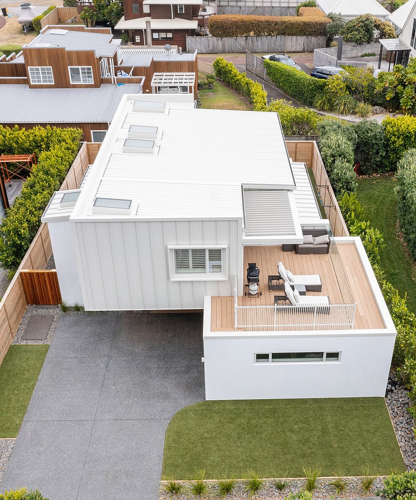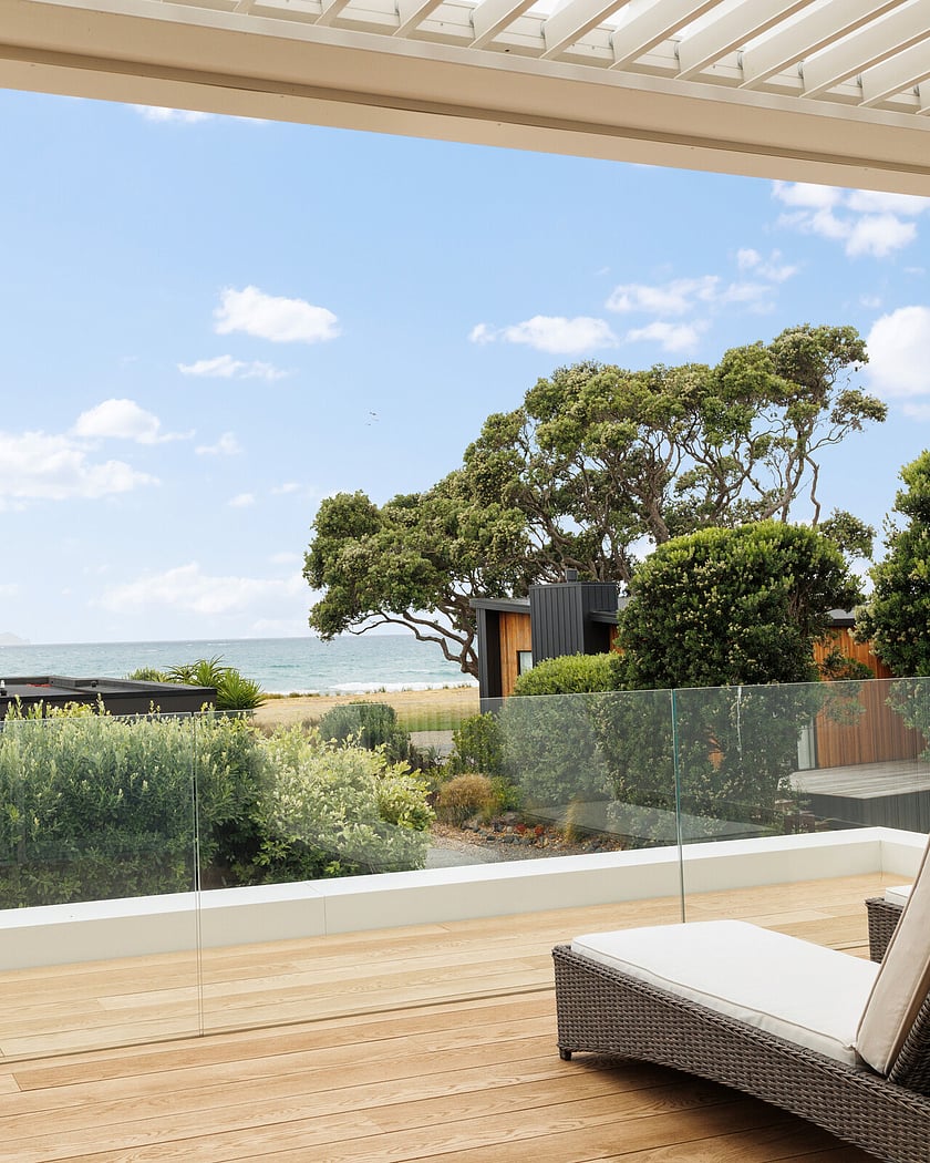 This 1990s Kiwi bach underwent a full architectural transformation, reimagining the home as a modern, high-end coastal retreat. Plaster cladding was replaced with sleek Titania Coloursteel wide-tray panels, giving the exterior a contemporary coastal feel. The floor plan was reconfigured to frame expansive ocean views, with extended living areas and large glazing units creating light-filled, seamless interiors. Luxury finishes and a timeless material palette elevate the home, while a Louvretec-covered entertaining area extends the main living space for effortless indoor-outdoor coastal living.