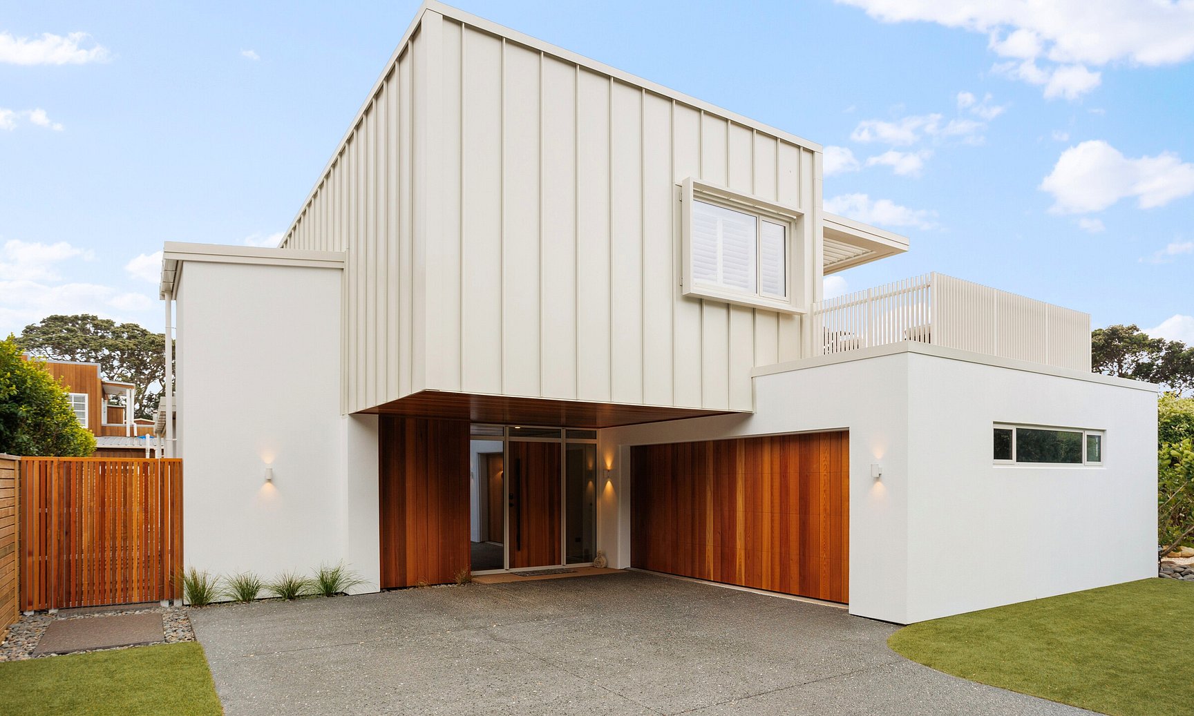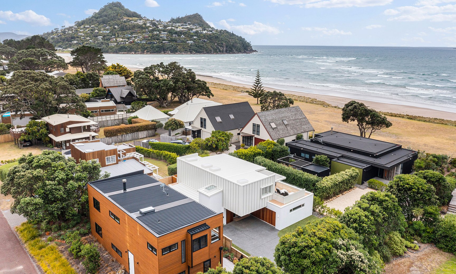 Architecturally transformed 'kiwi bach' with modern coastal style and sweeping ocean views.