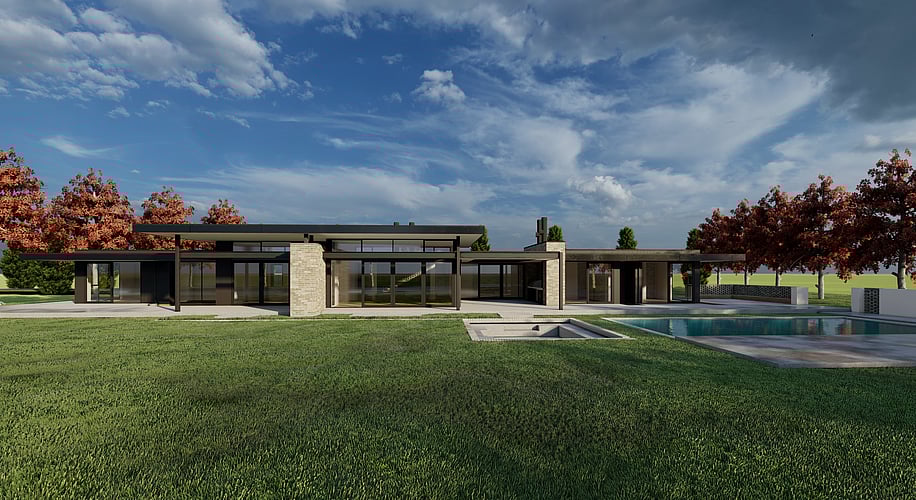 These 3D renders explore a mid-century modern-inspired home designed for a rural Cambridge setting. The brief was clear: channel a modernist aesthetic and capture the expansive rural vista from every room. Oriented to maximise northern aspect and solar passive performance, the design pairs an effortless floor plan with strong internal flow. Clean lines and floor-to-ceiling glazing frame views throughout, blurring the boundary between inside and out. The renders formed a key part of our material exploration, testing tone, texture, and balance to refine the architectural outcome.